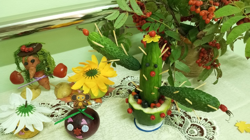 Представленные работы отличаются своей оригинальностью и неповторимостью. Самые обыкновенные овощи и фрукты превратились в шедевры. Каждая поделка интересна по-своему.