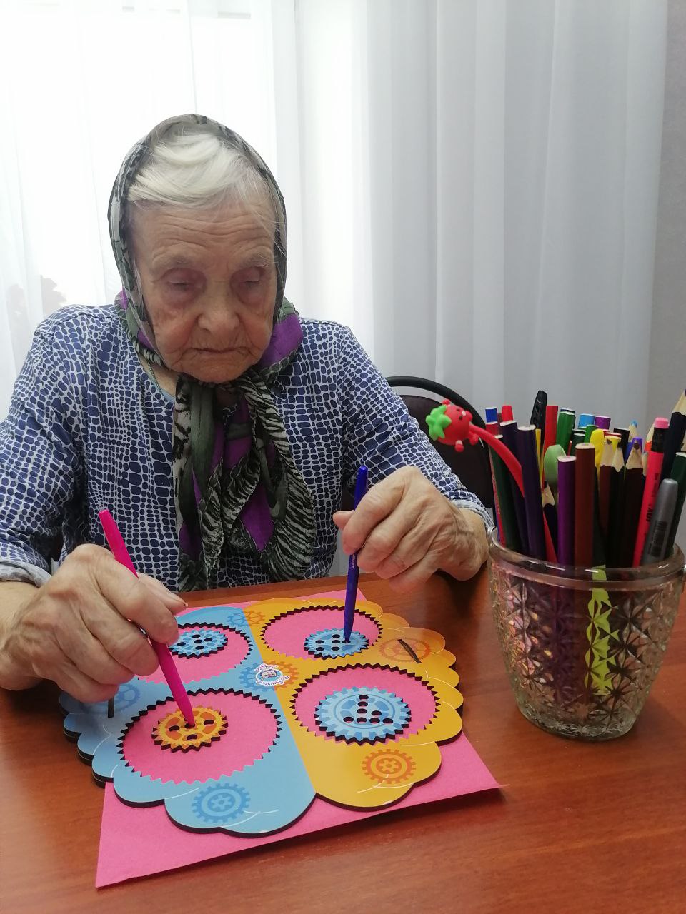 В отделении «Специализированный жилой дом для граждан пожилого возраста и инвалидов» ГБУ «КЦСОН Краснобаковского муниципального округа» продолжаются занятия в рамках программы «Ключи к здоровью».Пожилые люди активно занимаются нейробикой. Нейробика для пожилых — это комплекс простых физических и умственных упражнений, направленных на улучшение когнитивных функций, таких как память, внимание и речь, а также на стимуляцию новых нейронных связей в мозге. Цель — поддержание здоровья мозга и профилактика возрастных нарушений, включая деменцию. Примеры упражнений включают смену ведущей руки, выполнение непривычных действий с закрытыми глазами, решение головоломок, игры ,занятия с нейродосками и спирографом, что помогает сделать ум более гибким и улучшает координацию.